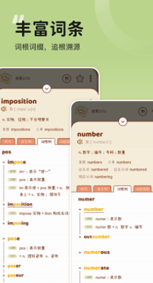 3、深度解析单词构成,提供词根词源、例句应用等立体化学习方案