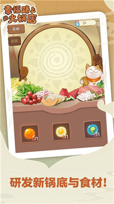 幸福路上的火锅店是一款充满烟火气息的模拟经营手游,采用明快的卡通画风与轻快的背景音乐,让玩家沉浸式体验火锅店经营的乐趣。作为店铺管理者,您需要从研发特色锅底到培训员工团队,从店面装修到品牌连锁扩张,全方位打造人气火锅品牌。