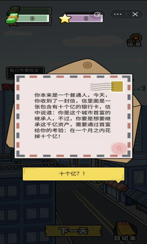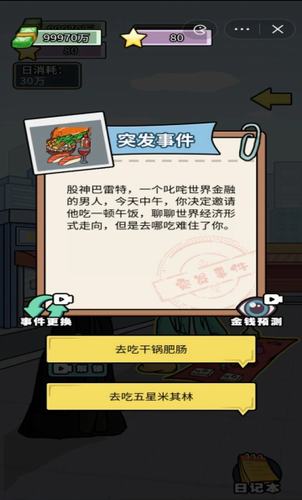 花光十亿休闲模拟游戏新版上线是一款以财富管理为背景的创意经营手游,游戏采用清新明快的卡通美术风格,创新性地将经典影视剧情改编为趣味挑战任务。玩家将化身临时富豪,在限定三十日内完成十亿资金的消费挑战,体验从豪车购置到产业投资的多样化消费场景。