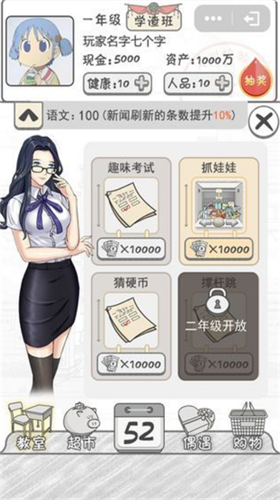 游戏设置12个年级晋升体系,每个阶段解锁特色玩法:初中部开放跳蚤市场,高中部引入股票模拟,大学阶段可组建商业社团。角色培养系统包含8项能力数值,通过完成课堂测验可提升谈判技巧,参与社团活动能增强风险预判能力,多维度的成长路线让每次选择都影响发展轨迹。