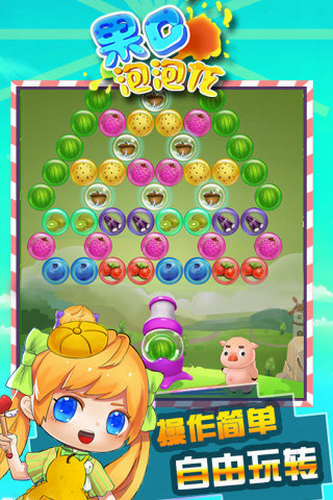 果C泡泡龙休闲水果消除手游是一款融合经典玩法与创新元素的休闲益智游戏,采用清新明快的卡通画风设计,将荔枝、蓝莓、梨子等鲜嫩多汁的水果作为核心消除元素。游戏在传统泡泡龙机制基础上,新增四季主题场景与策略性闯关玩法,玩家需通过精准发射果球完成消除目标,感受指尖迸发的解压乐趣。
