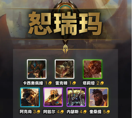 恕瑞玛体系包含1费至4费共7名角色,涵盖前中后期多个阶段。雷克顿与卡西奥佩娅作为低费卡适合前期过渡,阿兹尔与奎桑提则是后期关键输出与坦克。合理搭配人口激活羁绊层级是运营重点。