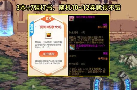 第三阶段增幅礼包大概率维持原有配置。包含三本神圣黄金增幅典籍与随机增幅券的神秘组合,为装备打造提供多重保障。其中随机礼盒虽以+10券为主要产出,但保留冲击高阶增幅的可能性,配合安全增幅机制可显著降低打造成本,特别适合追求装备突破的进阶玩家。