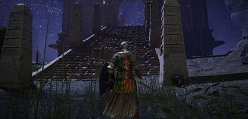 3、沿石质阶梯向第二层平台移动,在击败守护此处的熔炉骑士后,可发现第二处存档石碑,此处视野可俯瞰整个武器埋藏点
