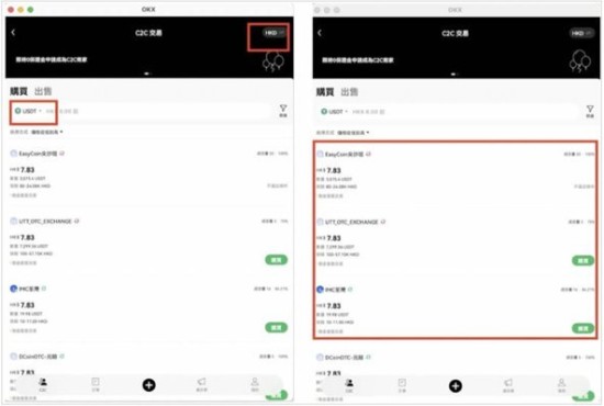 2.在C2C交易界面,优先选择法币类型中的【港元HKD】作为支付货币,随后在数字资产列表选定目标币种(支持USDT稳定币或比特币BTC)。根据自身支付方式偏好(包含线下现金交易或FPS转数快等渠道),筛选匹配的商户报价信息,确认无误后点击对应广告的【购买】按钮创建交易订单