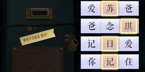 在道具栏仔细查看日记本时,会发现夹层中藏有「爸爸不许偷看~爱你」的便签纸。经过多次排列组合测试,最终确认有效密码为「爸爸爱你」四字组合。输入后成功开启日记本,揭晓了关键人物苏琪的家族往事。