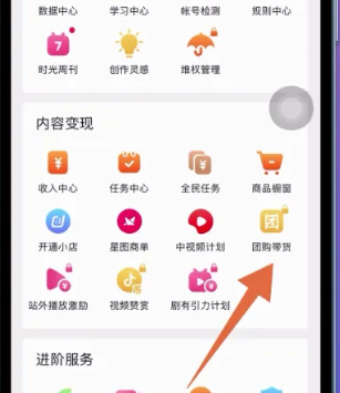 在创作者服务面板中,需进入「全部服务」分类查找具体功能。页面采用瀑布流布局设计,建议通过顶部搜索栏输入「团购带货」关键词快速定位目标入口,避免在功能导航中耗费过多时间。