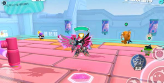 场景设定于粉色主题竞技场的地图,通过视觉设计强化了浪漫氛围与紧张对抗的反差感。场地中央设置的旋转金属立柱会以交替方向高速运转,两侧平台边缘会随时间推移逐步坍塌,这种双轨并行的淘汰机制要求玩家必须同步处理位移控制与环境变化。