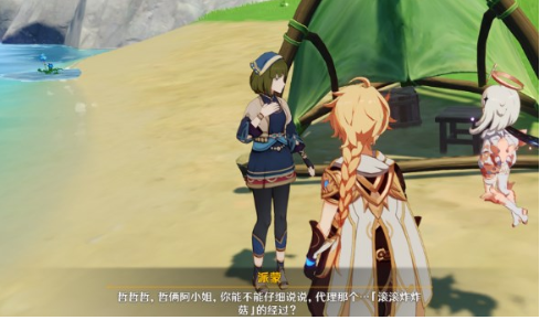 2. 传送至明冠山地七天神像后向东南方位移动,在悬崖边缘发现带有冒险家协会标志的营帐,与帐前神秘NPC对话时选择「关于新型料理」选项,此处关联丽莎早期研究的「元素爆破」课题;