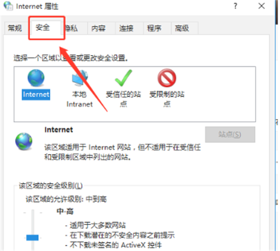 4、在弹出的Internet属性对话框中,顶部导航栏选择盾牌标识的"安全"选项卡,进入网站权限管理界面。