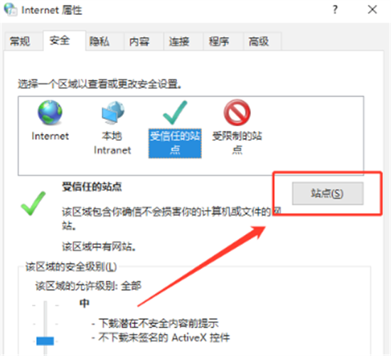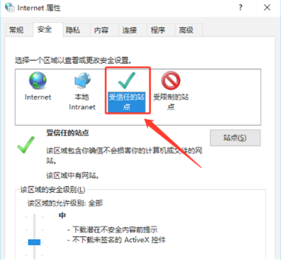 5、在安全层级选择面板中,选定"可信站点"分组进行特定网址管理,该分组内的域名将不受过滤规则限制。