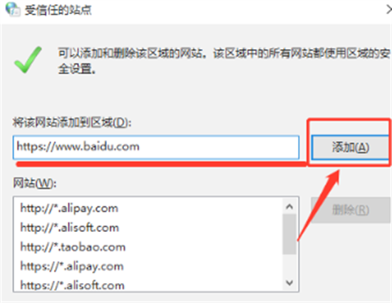 7、在地址输入框完整填写需放行的网络地址(需包含http/https协议头),通过右侧添加按钮将域名纳入信任列表,完成录入后关闭当前对话框。