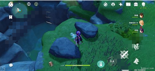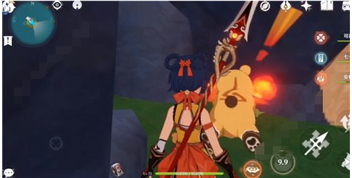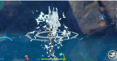 当水位调整至合适位置后,推荐选用长柄武器角色进行操作。角色需攀爬至图示岩壁特定高度,在空中下落过程中精准执行攻击指令。此操作要求玩家在角色接触水面瞬间同步完成两项动作:向石壁方向持续移动并长按冲刺按键。