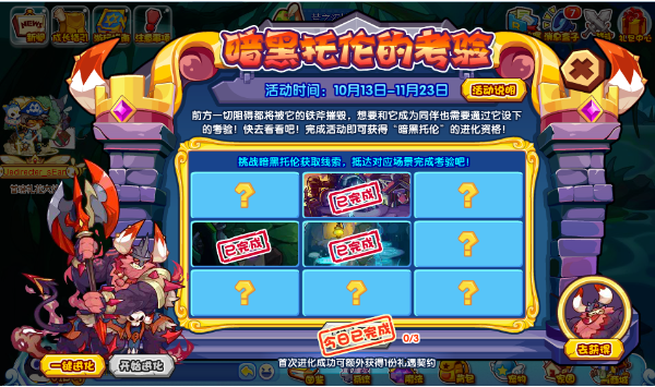 洛克王国暗黑托伦试炼玩法解析 本次限时活动自10月13日持续至11月23日,参与玩家每日可通过三次挑战机会获取珍贵线索。活动界面设有醒目的"线索获取"按钮,点击后将与350HP的暗黑铁骑展开对决。值得注意的是无论胜负都将消耗挑...